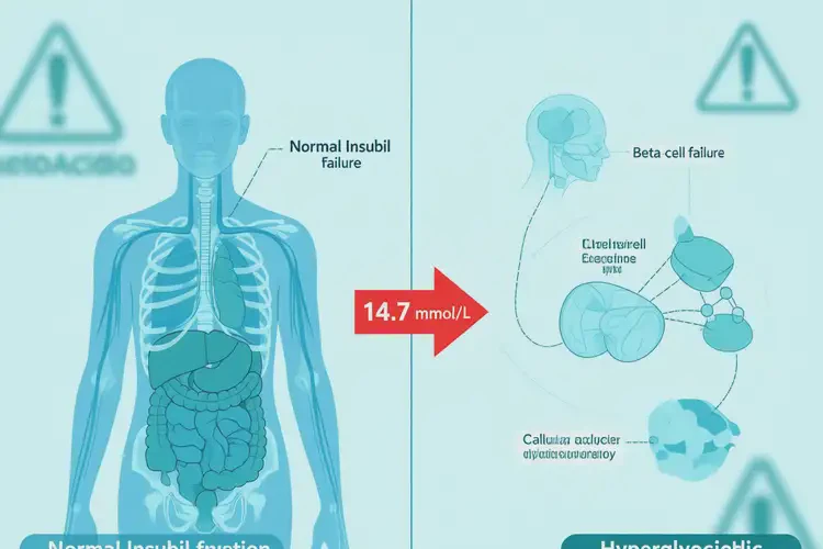 当血糖持续高于13.9 mmol/L且胰岛素严重缺乏时,身体转为分解脂肪供能,产生大量酮体。14.7 mmol/L的血糖值已高度提示酮症风险,尤其在女性中,若伴随呕吐、腹痛、呼吸有烂苹果味、意识模糊,即为糖尿病酮症酸中毒征兆,属急症,需立即静脉补液、胰岛素治疗及电解质纠正。脱水与电解质紊乱