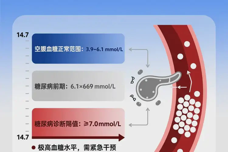 14.7 mmol/L的空腹血糖值不仅满足糖尿病诊断标准,且已进入严重高血糖警示区间,提示胰岛素分泌严重不足或胰岛素抵抗极度显著,机体无法有效利用或产生胰岛素,导致葡萄糖在血液中异常堆积。