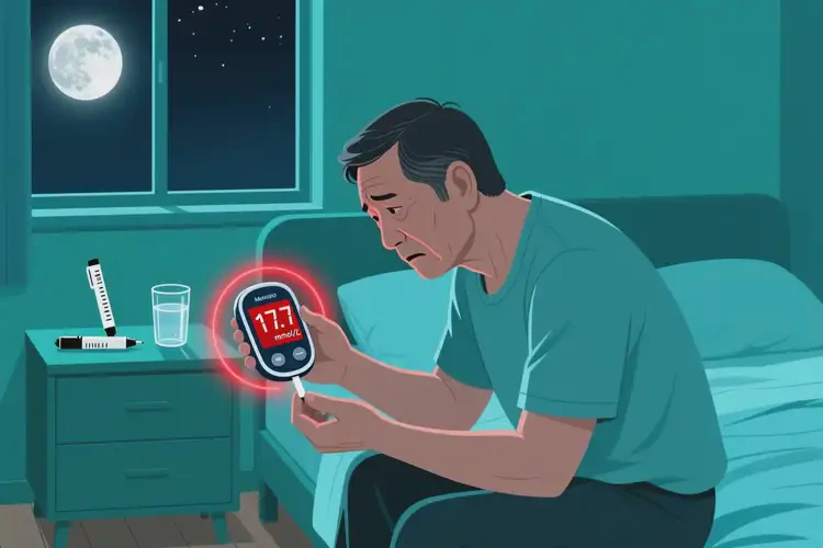 17.7 mmol/L的夜间血糖不是慢性病管理问题,而是急诊指征。需立即评估:- 血酮体水平:判断是否合并酮症。