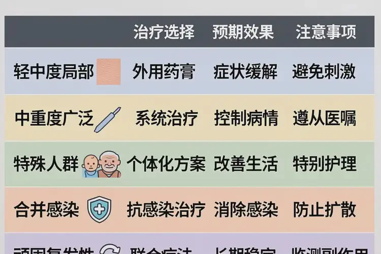 | 中重度、广泛 | 多部位受累、瘙痒重 | 外用激素为基础,必要时NB-UVB | 短期口服激素;环孢素/甲氨蝶呤;抗组胺 | 需规范随访与安全性监测,目标为长期缓解 |