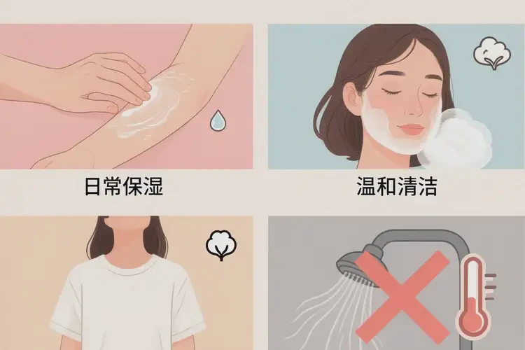 - 避免抓挠与摩擦,减少热水烫洗,使用温和清洁剂;衣物以宽松、纯棉为宜。